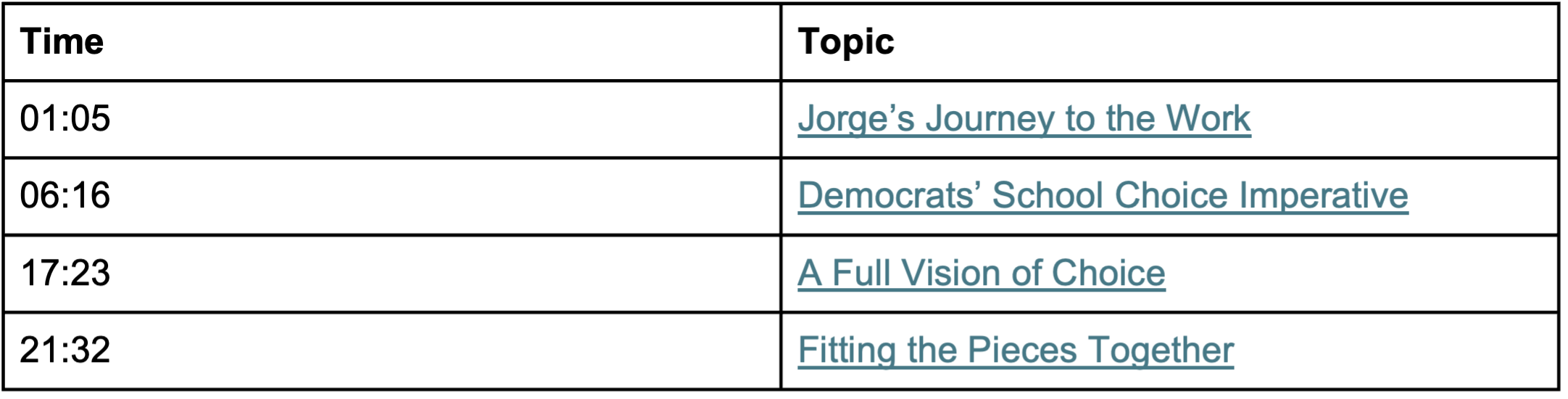 Jorge Elorza, the former mayor of Providence and now CEO of Democrats for Education Reform (DFER), joined me to talk about why it’s imperative in his view to support educational choices for families. Jorge talked about his own struggles as a high school student to becoming a law professor. He explained why he thinks that Democrats have lost their way on education reform, the role of governors and other executives in setting a bold education agenda, and the importance of innovations that empower families and bottoms-up solutions, such as education savings accounts and microschools—as well as how the concept of choice aligns with progressive values. The conversation was fascinating—and frankly the only downside to it was some Internet challenges that occurred during it. Despite those interruptions, I think you’ll enjoy the dialogue. I learned from it—and as always, you can read the transcript for anything that’s hard to hear.